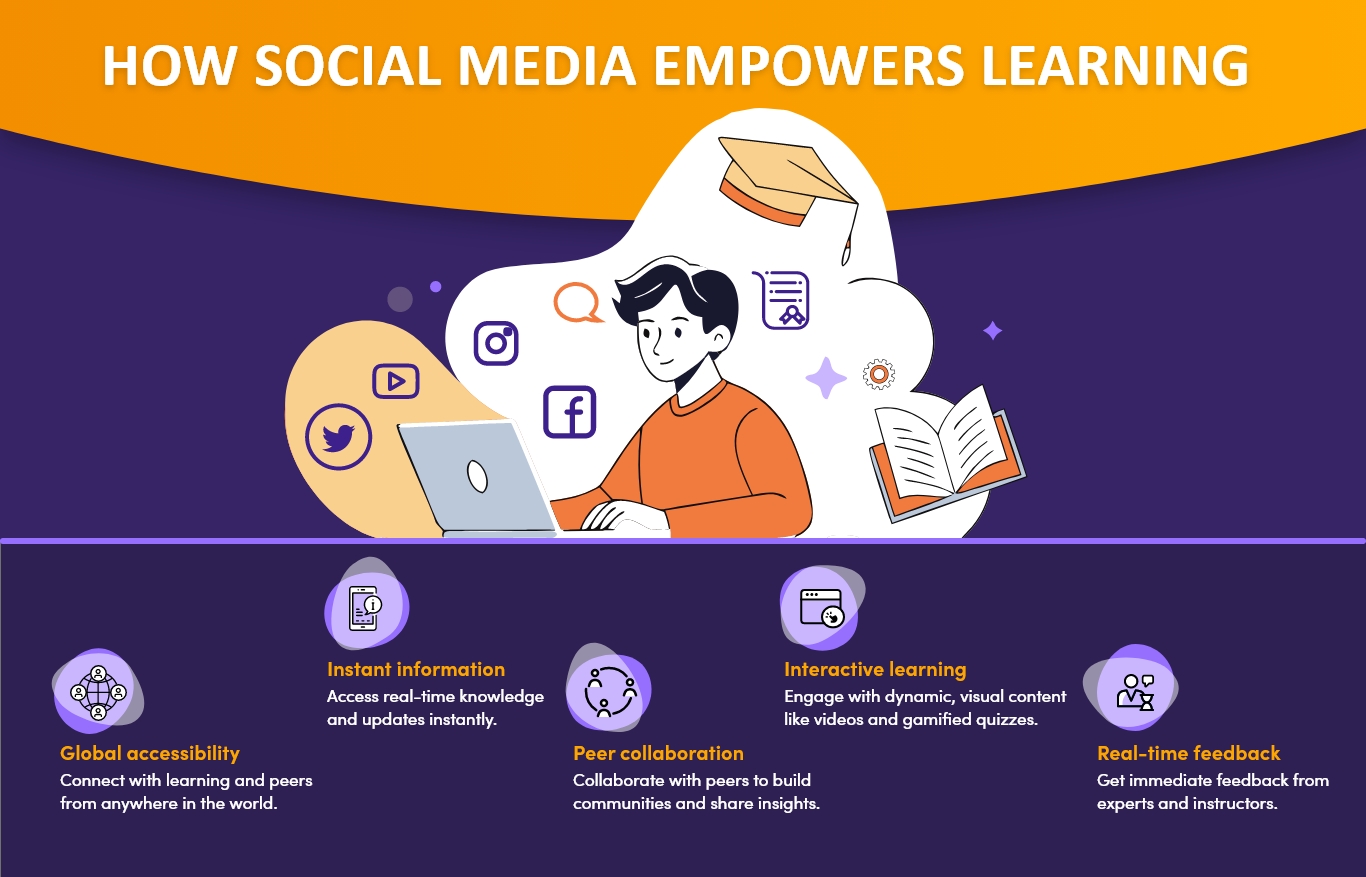 Social media helps people learn from teachers, experts, and other learners—even if they’ve never met before. It’s like having a big classroom that stretches across the whole world.
